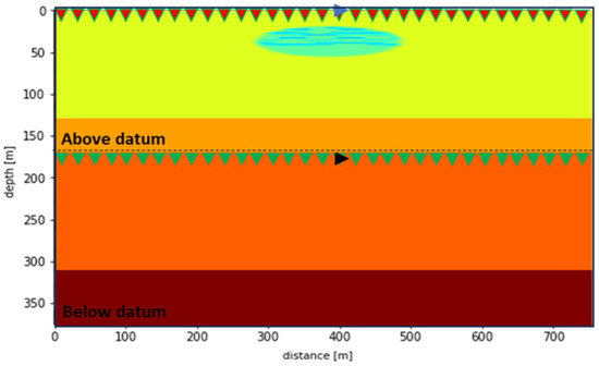 An illustration shows the model is divided into segments above and below the datum. The original source locations (blue) and receivers (red) are positioned at the surface. These are subsequently virtually shifted to the datum level (indicated by the black dotted line), represented by black (source) and green (receivers) points.