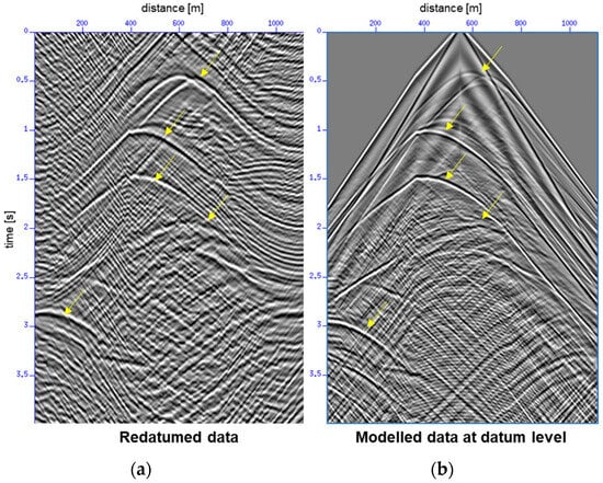The shot gathers from (a) redatumed data and (b) modelled data at datum level is compared to validate the accuracy of the redatumed data. The result indicates a strong alignment between the primary reflectors in both datasets as highlighted by yellow arrows.