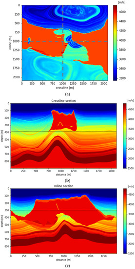 The velocity model is presented in three perspectives: (a) top view with dashed line indicate the chosen inline and crossline sections, (b) crossline section, and (c) inline section. In (b,c), the black dotted line signifies the datum level, where the source and receiver are shifted from surface to virtual depth through seismic redatuming. The migration computation occurs below the datum level.