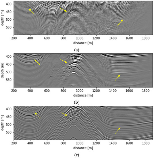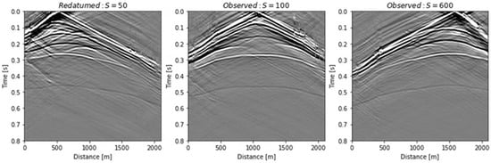 Furthermore, we conducted a modeling test to validate the accuracy of the obtained redatumed data. Using the identical source and receiver configuration at the datum level, we performed forward modeling to simulate data below the datum. Subsequently, these modeled data were compared to the previously obtained redatumed data, as shown in Figure 6. A strong correspondence is evident in most primary reflections between the two datasets. Equivalent results were published in [41], where a close agreement was observed between the redatumed data and the data simulated from the datum level. Hence, the reliability of redatumed data for seismic migration has been confirmed.