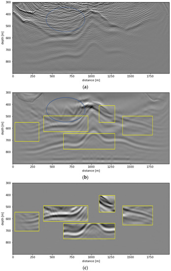 Subsequently, we explored the feasibility of simultaneously migrating multiple smaller target areas, instead of conducting migration for the entire region below the virtual depth. This approach was considered to mitigate computational costs. The results shown in Figure 10c demonstrate the practicability of employing a patch-based migration strategy with Kirchhoff migration. We observed that the image quality remained consistent when compared to migrating the entire area beneath the datum. This consistency can be due to the utilization of the same travel-time table for both approaches. Certainly, it is interesting for future research that involves exploring the feasibility of generating travel-time tables exclusively for selected patches within the area of interest. This approach has the potential to significantly reduce the overall turnaround time for the migration process.