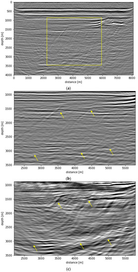 The (a) full-scaled migrated image computed from surface. The yellow box delineates the target area. The (b) magnified view of the target area from (a), which then compared with the (c) migrated image obtained from redatumed data. Similar outcomes to those observed with synthetic data are evident. Improved signal-to-noise ratios and enhanced fault visibility as well as structures continuity are seen in the target-oriented migration compared to full-scale migration (highlighted by yellow arrows).