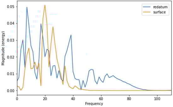 The migrations were computed for both full-scale model and target-oriented model. Figure 11 presents a comparison between migration based on surface recorded data and redatumed data. Figure 11b provides a closer view of the target area, delineated by the yellow box in Figure 11a, which displays the migrated image computed from surface. The redatumed data were utilized for the migration of the target area, with the resulting image as shown in Figure 11c. The result shows that the migrated image utilizing redatumed data provided an enhanced signal-to-noise ratio and more distinct layering structure in the imaging. To validate the obtained results, we conducted a comparison of the frequency bands, as demonstrated in Figure 12. The outcome of this comparison clearly indicates that the frequency band has been improved, enabling the retrieval of higher frequencies.