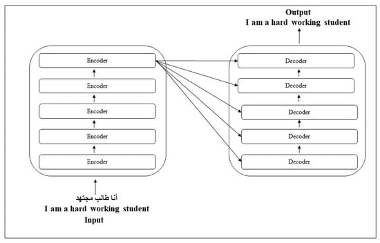 Figure 1. Pretrained transformer model architecture.According to Vaswani et al. [36], “The Transformer is the first transduction model relying purely on self-attention to calculate representations of its input and output without employing sequence-aligned RNNs or convolution”. Using layered self-attention and pointwise, completely linked layers, the transformer conforms with the encoder decoder’s overall architectural design. By translating a query and a collection of key-value pairs to an output, the transformer’s attention function is calculated. The result is then calculated as a weighted sum of the values, with each value’s weight determined by the query’s compatibility function with the connected key, where dimension is of the keys, and dimension is of the values. Moreover, the transformer performs the attention function in parallel, resulting in output values using “multi-head attention” as shown in Equation (1):Transformers ignore convolutional and recursive layers in favor of multiheaded self-attentional layers as their foundation. They take advantage of the attention mechanism in three different ways. First, it is employed in encoder–decoder attention layers, where the preceding decoder layer generates queries and the encoder output consists of memory keys and values. Second, there are six internal layers in every encoder and decoder. Each of them is made up of two sublayers: positionwise completely linked feedforward networks and multihead self-attention. Transformers are also less expensive in terms of time.