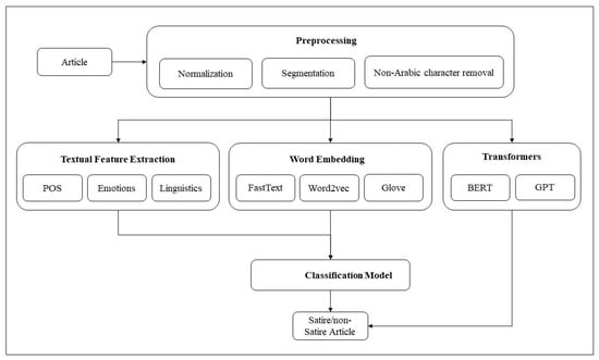 Our methodology consists of preprocessing, feature extraction, and the classification model steps as shown in Figure 2. Preprocessing is explained in detail in Section 4.2. Then, features are extracted using n-grams, textual analysis, and word embeddings (Section 4.3). We compiled the first dataset of Arabic satirical articles that is collected as described in Section 4.1. The data are used with ML and DL classification models.