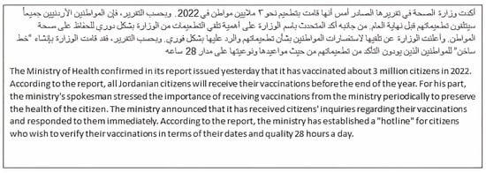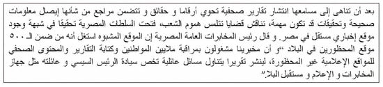 To balance the dataset, we manually collected 768 non-satirical articles from formal newspapers, such as Okaz (https://www.okaz.com.sa/articles (accessed on 1 September 2023)) and Sabq (https://sabq.org/ (accessed on 1 September 2023)). The articles had diverse topics such as politics, economics, religion, and technology. In total, the dataset included 1536 satirical and non-satirical articles. Table 1 shows the statistics of the collected articles; word length is the number of characters in each word and sentence length is the number of words in each sentence. A sample of a satirical article, that is extracted from the satiric platform “alhudood,” is shown in Figure 3, which is depicting, in a satiristic manner, a security operation undertaken by police forces that targeted news platforms.