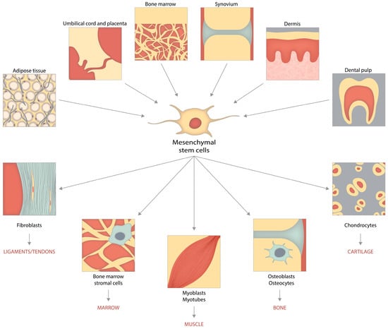 MSCs are pluripotent cells that can differentiate into a wide variety of cell types [111,112,113,114,115]. These cell types include chondrocytes, adipocytes, osteoblasts, myogenic, and neuronal cells [116,117]. MSCs have been discovered in a variety of tissues, including BM [118], umbilical cord (UC) blood [119], UC tissue [120], placenta [121,122], periosteum [123,124], trabecular bone [124,125], adipose tissue [126], synovium [127], and skeletal muscle [128]. According to [127], the principal sources of therapeutic MSCs are found in adipose tissue and bone marrow. They are distinguished from other cells by their fibroblastic appearance and the particular markers, CD11b+, CD14+, CD34+, CD45+, HLA-DR+, CD73+, CD90+, and CD105+, that they express [128].