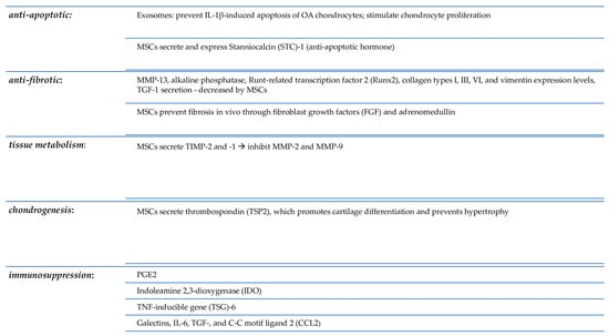 Therapeutic effects: owing to their ability to differentiate into numerous cell types, including myocytes, tenocytes, and ligament cells, MSCs appear to be a viable therapy option for knee OA [111,112].