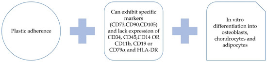 Although the criteria for classifying human MSCs are fluid and subject to change, most studies concur on the three distinguishing features of human MSCs defined by the International Society for Cellular Therapy (ISCT) [128,154]. Figure 3 highlights these features.