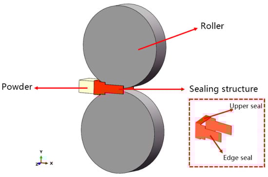 The rolling components of the above LGS prototype were selected, and the structures that have little impact on the results were omitted. The powder is simulated as a deformable body and defined as a continuous medium without considering the impacts of temperature and air. The stiffness of the sealing structure and the roller is much greater than that of the powder, so they were defined as discrete rigid bodies without considering their deformation and wear during the rolling process. The simplified model is shown in Figure 2 below, with the radius of the roller being 50 mm, its thickness being 25 mm, and the thickness of the sealing structure being 1 mm.