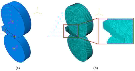 The mesh element type for the roller and sealing mechanism, as shown in Figure 3b, is a 4-node rigid element with a size of 1. The powder is divided into hexahedrons, and the element type is an 8-node linear reduced integration element. The rollers and sealing mechanism are discrete rigid bodies, and the accuracy of the mesh has a negligible impact on them. Therefore, the mesh size of the powder needs to be refined.