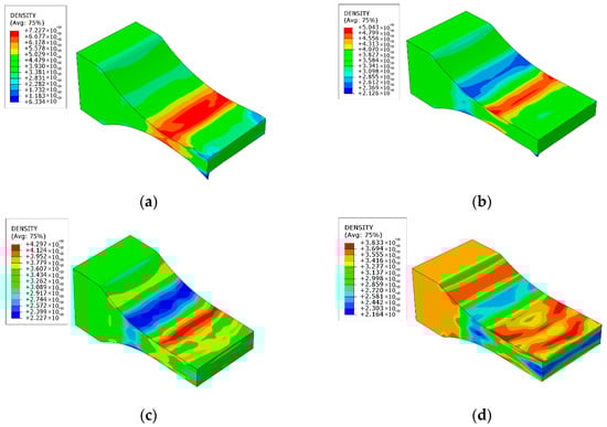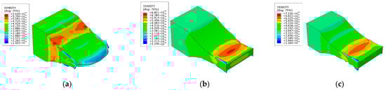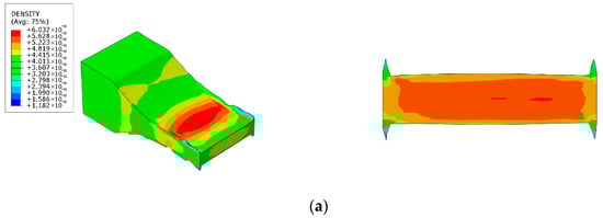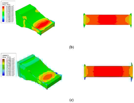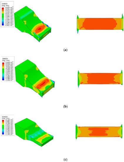 Density distribution under different friction coefficients of rolling surface: (a) sheet forming with a friction coefficient of 0.2; (b) sheet forming with a friction coefficient of 0.4; (c) sheet forming with a friction coefficient of 0.6.