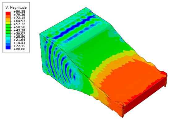 As the roller speed increased, the linear speed of the roller surface increased, which directly affected the distribution of the surface speed of the tablet. In order to analyze the speed distribution characteristics in the rolling area, the speed distribution diagram of Figure 5a was selected, as shown in Figure 6. At the tail of the tablet, the powder speed was low (blue-green area), mainly due to the friction of the baffle, which hindered the movement of the tablet in the feeding direction. At the gap, the speed of the tablet in the width direction was lower than the speed in the center, which indicates that the powder flow was low and, therefore, the density was low. The sealing structure on the upper and lower sides mainly affected the powder speed on the roller surface by hindering the powder before compression. From the beginning of the powder engagement to the gap extrusion, the speed field presented a certain distribution. As the linear speed of the roller surface was high, the powder was rolled, and the speed gradually increased, approaching the speed of the roller surface.
