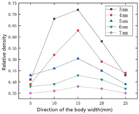 Density distribution under different roller clearance: (a) sheet forming with roller clearance of 3 mm; (b) sheet forming with roller clearance of 5 mm; (c) sheet forming with roller clearance of 6 mm; (d) sheet forming with roller clearance of 7 mm.