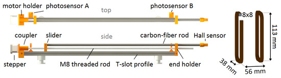 The layout of the automated magnetometer as seen from the top and from the side. Orange-colored parts are 3D-printed. The rotation of the stepper motor shaft is coupled to the threaded rod via a coupler. An M8 nut is embedded in the slider to convert the rotation of the rod into the translational motion of the carbon fiber tube, which supports the Hall sensor. The end holder uses a ball bearing to assure smooth rotation of the rod. The photosensors establish the minimum and maximum range of the motion to avoid collisions with the supporting structure in case the information about the current position of the sensor is lost. The dimensions of the pair of coils (1 mm wire, 8 × 8 turns) used for testing of the device are shown.