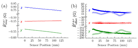 where are sensor readouts with no source (ns) and with the source present (ws) for two polarities (+/−). In principle, the values marked with the prime symbol are not the same as the ones without the prime symbol because they are obtained many seconds apart. We assume here, however, that the stray fields are static on the time scale of the measurement and we do not distinguish between the two. We do not make this assumption about the offset field as this can be influenced by the fields the sensor has been exposed to. We have observed such variation in the sensor offset (see Section 4); therefore, the measurement of both and is necessary to reliably extract the field characterizing the source, the environment and the sensor: