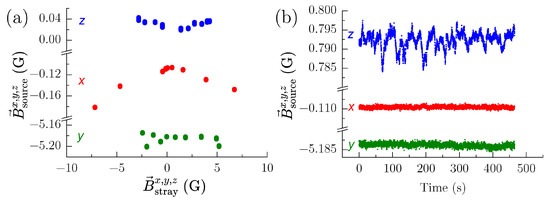 It is worth noting, as discussed in Section 2, that the polarization flipping function of the sensor is not always necessary to determine the magnetic field generated by the coils or permanent magnets, . Any method of determining the magnetic field created by the source that corrects for stray fields relies on the ability to remove the source (turn off the coils or remove permanent magnets). In principle, the magnetic field measurement with the coils on () and coils off () would provide sufficient information to extract the value of interest, . However, we aim here at the versatility of the setup such that our design can also be used to reliably measure stray fields, which can be completed only if the internal offset of the sensor can be determined.