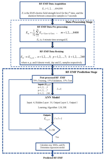 The methodology of this study consists of three main stages, as illustrated in Figure 2. In the figure, 604,800 refers to the number of electric field strength data recorded at 5-s intervals for 5 weeks (35 days). In addition, 72 were the data recorded at 5-s intervals corresponding to 6 min. Also, 8400 represents the number of electric field strength data averaged over 35 days and 6 min. Furthermore, 240 refers to the number of electric field strength data averaged over 1 day and 6 min. n denotes the week index, ranging from 1 to 5, and p denotes day index from 1 to 7. k is the 6 min averaged electric field intensity over a day with values between 1 and 240, and l is the number of times the network trained. The first stage involves the measurement of RF-EMF data, the second stage involves the processing of measurement data, and the third stage involves the creation of the RF-EMF prediction model. The details of each stage are provided in the following sections.