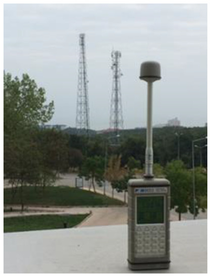 In this study, RF-EMF measurements were performed on a suburban campus during five weeks of the fall semester (35 days in total), when there are many active users of the base stations, in a location that directly sees (Figure 4) the base stations. The line-of-sight path length is ~100 m, and technical specifications of the base stations are as given in [37]. The PMM 8053 EMF meter with an EP-330 isotropic probe was used to measure the instantaneous RMS electric field strength (Ei) in the frequency band of 100 kHz to 3 GHz. The duration between consecutive samples is five seconds.