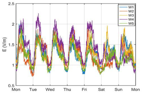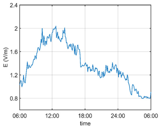 During the five-week period of measurements, a total of 604,800 Ei values were recorded. Long-term daily measurements were started at 06:00 in the morning and ended at 06:00 the next day. Six-minute averages were used according to the ICNIRP’s guidelines. Because samples were taken every 5 s, a total of 72 samples were taken in 6 min. The time-averaged electric field strength (Em) was calculated as in (4).