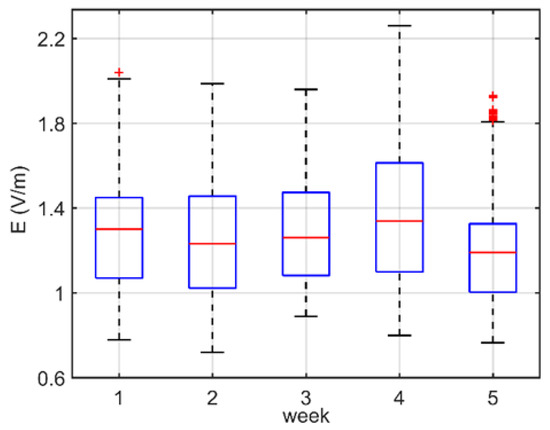 The RF-EMF measurement results of each week (five weeks in total) are given in Figure 6. As can be concluded from the figure, there are differences in RF-EMF levels not only at different times of the day but also between working and nonworking days. The one-week-long measurement data show RF-EMF data starting at 06:00 on Monday morning and continuing until 06:00 on Monday morning the following week. The statistical evaluations of weekly measurements are given in Figure 7. In figure, red lines indicate the medians, the bottom and top edges of the blue boxes indicate the 25th and 75th percentiles, and red plus signs illustrate the outliers. The mean RF-EMF value for the first week is 1.2757 V/m, and the mean values for the second, third, fourth, and fifth weeks are 1.2513 V/m, 1.2849 V/m, 1.3880 V/m, and 1.1968 V/m, respectively. Additionally, the outliers in the data from the fifth week may be due to exams held on campus.