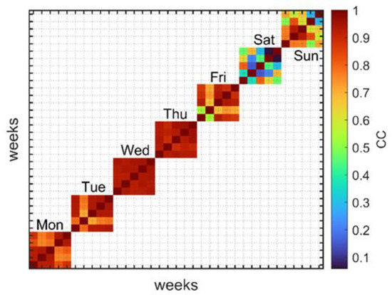 Daily cross correlation coefficients of RF-EMF levels for each week.