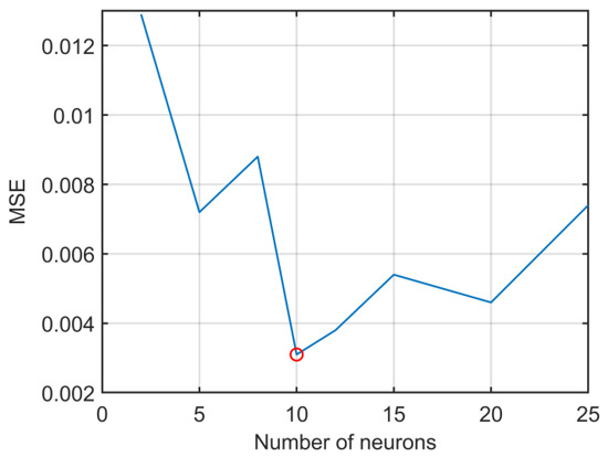 The optimal number of hidden neurons in this model was determined by randomly partitioning the input data and evaluating the test MSE for various numbers of neurons (max. 25 neurons) using the same partitioned data. The number of neurons that resulted in the minimum test MSE was chosen. The change in test MSE versus the number of hidden neurons used are presented in Figure 11.