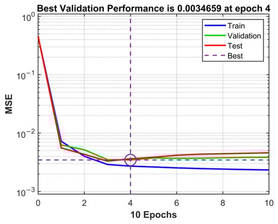 Regression analysis was performed for training data, testing data, validation data, and all data for fifty times, and the performances were averaged. MSEs and state transition performances were determined, and error histograms and regression plots were obtained. For the sake of brevity, only the results of the LM for Monday are given in the following figures. Figure 12 shows the MSE performance for training, validation, and test data as a function of epoch for one randomly selected run of the LM. As seen from the figure, the best validation performance was achieved at four epochs, with an MSE value of 3.47 × 10−3.
