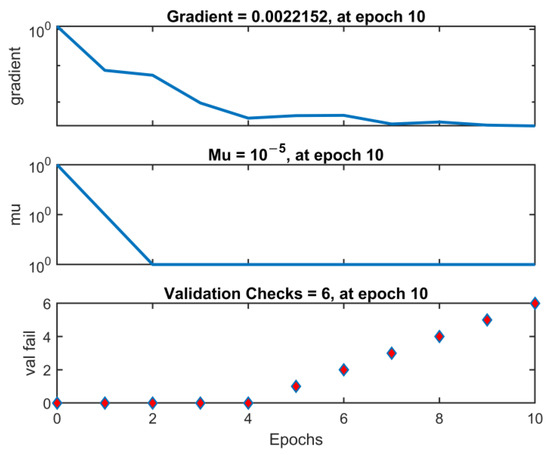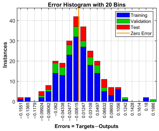 Figure 13 illustrates the training state values for one randomly selected run, in which the value of the gradient after ten epochs was 2.22 × 10−3 and mu was 1.00 × 10−5. The training process has been ended after six validation failures. The error histogram of one run with a reference zero error line is shown in Figure 14. Though there are some outliers; these data points are not largely different, and the error histogram roughly follows a normal distribution.