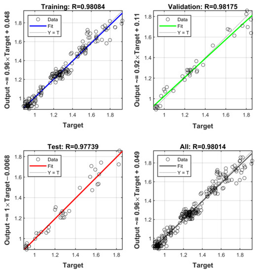 The regression plots of the average of fifty runs for training, validation, testing, and all data are given in Figure 15. It can be seen from the figures that the average regression coefficient, R, is 0.981 for training data, and the average R for validation, testing, and all data are 0.982, 0.977, and 0.980, respectively, which indicates a strong correlation and high performance.