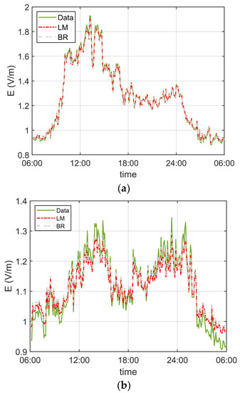 The highest average R values for all data were obtained for Monday for both methods, and the lowest was seen for Sunday. The fitting performances for these days are shown in Figure 16a,b, where the data represent target data for Monday and Sunday. As can be concluded from the figures, the reason for the best fitting of Monday’s data is the smooth fluctuations in the measured RF-EMF levels, whereas the deep fluctuations yield lower fitting performance for Sunday. When all of the data was analyzed, the developed LM and BR models showed similar fitting performances and could accurately predict the RF-EMF levels in the medium.