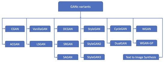 At the top level of Figure 1, the main GANs that we have identified as benchmarks in the field are presented. These include models such as StyleGAN, Conditional GAN (cGAN), Vanilla GAN, Deep Convolutional GAN (DCGAN), CycleGAN, and Wasserstein GAN (WGAN) [4,12,13,14,15,16,17,18]. Each of these models has its own unique characteristics and applications in data generation.