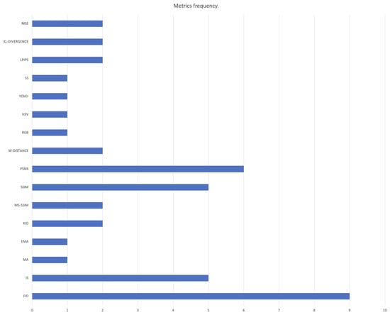 Figure 5 is primarily intended to illustrate that, although generative adversarial networks (GANs) are often associated with high-definition image generation, our comprehensive literature review reveals a wide variety of metrics used to evaluate GAN-generated images. These metrics have been variously applied in different contexts, demonstrating their versatility beyond GANs. It is important to note that all the metrics mentioned in our article are derived from a thorough analysis of the state of the art in this field. Among the most commonly used metrics are FID, PSNR, IS, and SSIM, with FID being particularly relevant due to its specific definition for generative models such as GANs.