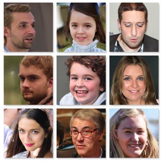 - Flickr Diverse Faces (FDF): This comprises a vast collection of 1.47 million human faces with a resolution of 128 × 128 or higher. Each face in the dataset is accompanied by a bounding box and keypoint annotations, offering precise localization information. The dataset is designed to exhibit diversity in various aspects, including facial pose, occlusion, ethnicity, age, background, and scene type. The scenes captured in the dataset encompass a range of contexts, such as traffic, sports events, and outdoor activities. Regarding facial poses, the FDF dataset offers more diversity than the FFHQ and Celeb-A datasets, although its resolution is lower than that of the FFHQ dataset. The primary objective of the FDF dataset is to facilitate the advancement of face recognition algorithms by providing a publicly available resource that includes source code and pre-trained networks. The face images in the FDF dataset were extracted from a pool of 1.08 million images in the YFCC100-M dataset, and the annotations were generated using state-of-the-art models for accurate and reliable results [45]. The FDF dataset, with its high-quality annotations and diverse range of faces, provides a valuable resource for advancing face recognition algorithms.