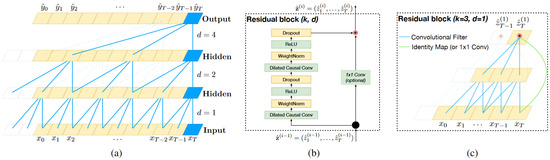 Architecture of a TCN. Image and caption credit: Bai et al. [46]. Reproduced with the authors’ permission. (a) A dilated causal convolution with dilation factors and filter size . The receptive field is able to cover all values from the input sequence. (b) A TCN residual block. A 1 × 1 convolution is added with residual input and output having different dimensions. (c) An example of residual connection in a TCN. The blue lines are filters in the residual function and the green lines are identity mappings.