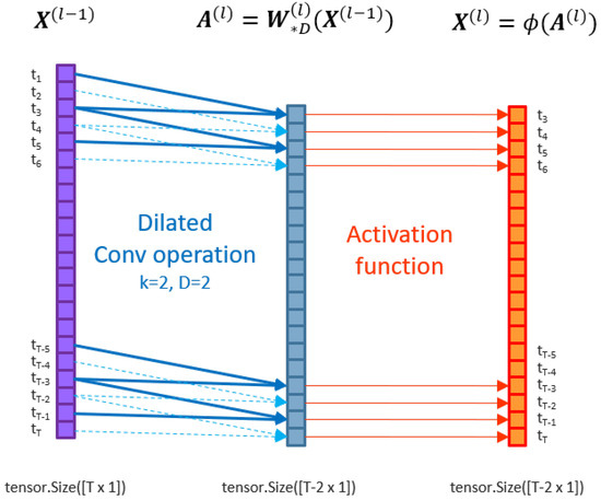 Figure 4 below demonstrates the application of the dilated convolution operation on input matrix for , and unit stride. This produces an activation tensor where the time dimension before element-wise activation function is applied.