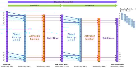 A TCN , parameterised by , consists of L hidden layers referred to as temporal blocks, which are composites of element-wise activation functions and dilated convolution operations of dilation D and kernel size K. The input datum X is an -variate tensor of time sequence length . At layer in the TCN, the input and output dimensions will be denoted and , respectively.