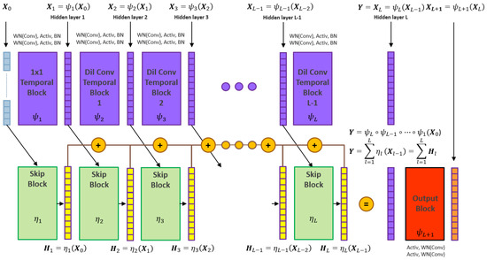 where are inputs to layer l, is the temporal block for layer l such that , and is the skip connection for layer l accumulated to the final layer L such that: