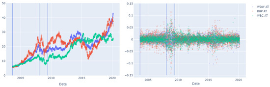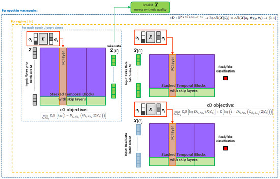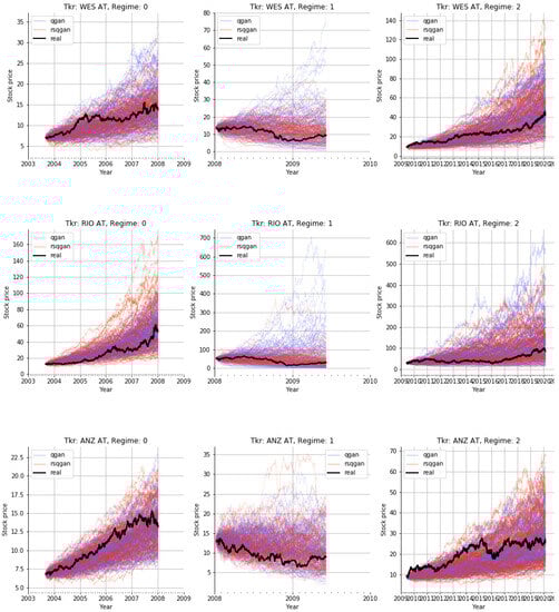 As noted in Section 1, none of the above studies explicitly considered regime switching and regime imbalance in conditional generative modelling. Failure to account for this characteristic of complex financial market behaviour leads to ‘unconditional’ models being trained in ‘mixed-regime environments’ and may not be reflective of current or future regime conditions. Though some cGAN studies attempt to account for regime imbalance [15] by selecting a balanced period, date period selection was based on heuristics rather than an unsupervised breakpoint detection algorithm. Though Fu et al. [15] explores the performance of cGANs to interpolate and extrapolate synthetic data generation for low-dimensional ordinal and conditional variables on toy data, the high-dimensional conditioning variables from other cGAN studies [13,14] that may be considered representations of regime conditions are in very high temporal dimensions, i.e., 252 days and 100 days, respectively. It is indeterminate if a better lower-dimensional manifold representation for the conditioning variable might improve performance, particularly if interpolated or extrapolated conditional variables are provided to the model.