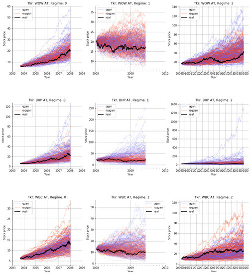 In addition, the aforementioned cGAN studies for FTS data used GAN quality evaluation measures tailored for specific commercial applications: (1) the fine-tuning of trading strategies and/or data augmentation for training trading strategies to maximise risk-adjusted returns [13]; (2) value at risk and expected shortfall estimation [15]; and (3) implicit evidence that cGAN-generated synthetic data augments training data sets and improves the out-of-sample discriminator performance [14,19].
