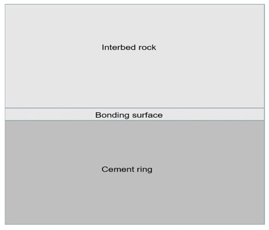 The cement–rock bond interface can be effectively represented as a transitional layer between the rock and cement sheath. To explore the damage mechanism of the bonded interface rocks, a simplified model was utilized. In this model, the rock, cement sheath, and bond interface rock portion were considered as homogeneous media with uniform properties, as depicted in Figure 1. Additionally, it is assumed that each medium satisfies the Mohr–Coulomb strength criterion and is not influenced by the surface shape of the bond interface rocks.