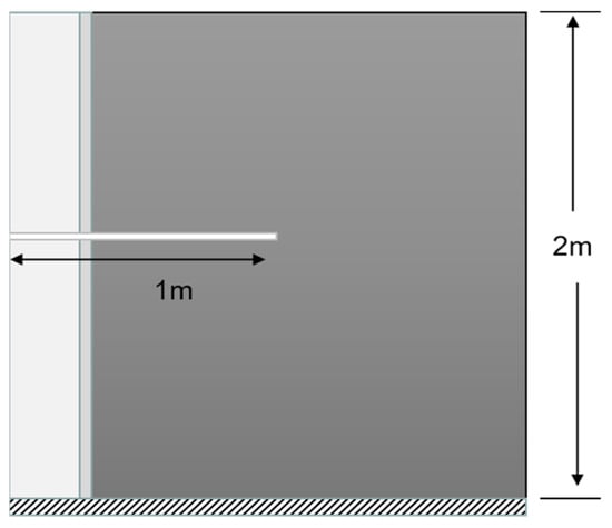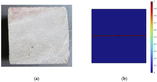 Water channeling in the casing of water injection wells is caused by the progressive advancement of injected water along the bonded surface rock. The primary cause of external water channeling in the casing is the damage to the bonded surface rock induced by fluid–solid coupling. COMSOL simulation software, a widely utilized and powerful tool for multi-physics field simulations, is capable of effectively handling coupled problems in multiple physical domains. Moreover, its numerical algorithms offer high precision, and the obtained numerical solutions have undergone extensive testing and verification. In this study, a model of the bonded surface rock outside the casing of a water injection well was established using COMSOL software to simulate the evolution of damage under the influence of fluid–solid coupling. The model comprises a square shape measuring 2 m × 2 m and features a central crack with a length of 1 m, as shown in Figure 6. The crack experiences a pressure loading rate of 0.5 MPa/s. The parameters utilized in the model can be found in Table 4.