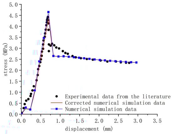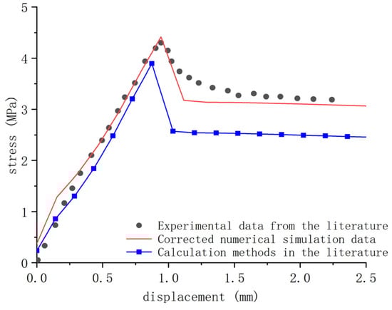 In Figure 5, the stress–displacement curve for the rock joint interface under shear stress at 4 MPa normal pressure is shown. The curve is compared between the bonding force calculated using Formula (5) from the literature, the modified model, and the experimental results from reference []. The trend of the modified model curve closely aligns with the experimental curve. The experimental peak shear stress is 4.3 MPa, while the simulated peak shear stresses for the modified model and the literature are 4.41 MPa and 3.89 MPa, respectively, with errors of 2.56% and 9.53%. Compared to the results from the literature, the modified model exhibits an improved accuracy of 6.97%, indicating a significant enhancement in computational precision.