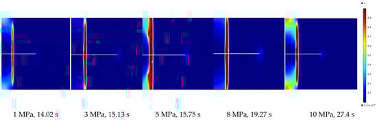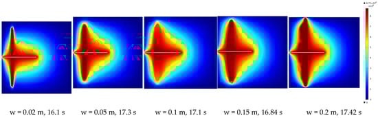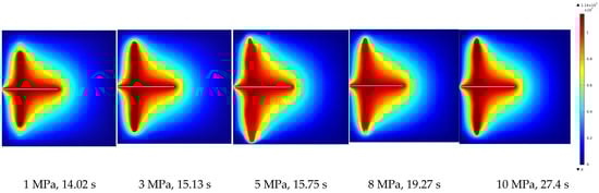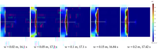 We conducted numerical simulations on models of bonded rock surfaces with varying width dimensions: 0.02 m, 0.05 m, 0.1 m, 0.15 m, and 0.2 m. The objective was to explore the influence of width variations on the progression of damage. The numerical simulation results were analyzed to evaluate the impact of width on rock damage under fluid–solid coupling and examine the patterns of damage evolution on bonded rock surfaces with varying widths. As shown in Figure 11 and Figure 12, it is evident that increasing the water injection pressure leads to the primary propagation of damage along the interface between the rock and the protective cement sheath. During the bonded rock surface damage, significant damage is observed on one side of the cement sheath at the interface position. Hydraulic pressure mainly propagates along the damaged zone and around the cracks.