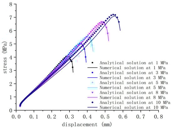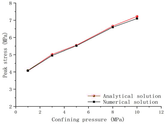 Numerical simulations were performed using COMSOL software to model the damage evolution in the bonded rock under fluid–solid coupling. The resulting numerical solutions were compared with analytical solutions derived from the damage model calculations. The evolution of shear stress on both sides of the crack demonstrates a similar pattern, as shown in Figure 9. With the increase in confining pressure, there is a corresponding rise in the peak stress during the damage process of the bonded rock surfaces. This suggests that inducing damage becomes more challenging as the confining pressure increases. Figure 10 illustrates the variation in peak stress during the damage process of the bonded rock surfaces under varying levels of confining pressure. The analytical solutions for the peak stress values at confining pressures of 1, 3, 5, 8, and 10 MPa are approximately 4.087, 5.021, 5.55, 6.66, and 7.22 MPa, respectively. The corresponding numerical solutions for peak stress are approximately 4.068, 4.952, 5.517, 6.592, and 7.096 MPa, respectively. The average error between the numerical and analytical solutions is 1.03%. Thus, the numerical simulation results accurately and scientifically describe the damage characteristics of the bonded rock surfaces under varying confining pressures.