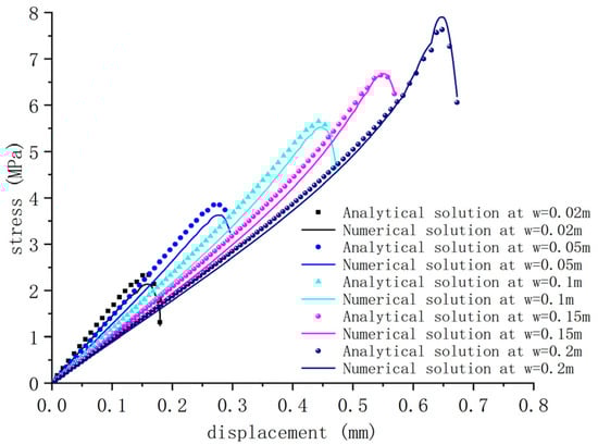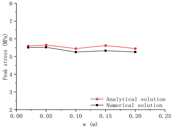 Based on Figure 13 and Figure 14, it can be observed that as the width (w) of the cemented interface rock increases from 0.02 m to 0.2 m, the shear stress exhibits a relatively small change. The peak shear stress remains relatively stable with respect to the width of the cemented interface. The numerical solutions obtained from the model closely match the analytical solutions, with a maximum error of 5.44%.