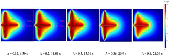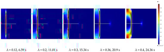 Based on Figure 15 and Figure 16, it is observed that when the λ value ranges from 0.12 to 0.36, damage occurs on the bonded rock surfaces under the influence of water injection pressure. The damage propagates towards the vicinity of the interface, parallel to the cement sheath, while the fluid pressure is distributed along the bonded surface and cracks. When the value of λ is 0.4, the damage on the bonded rock surfaces initially expands along the interface between the cement sheath and the rock and subsequently propagates towards the wellbore. The fluid pressure is significantly controlled by the damaged zone, resulting in a shorter length of damage on the bonded rock surface and a smaller range of diffusion for the fluid pressure.