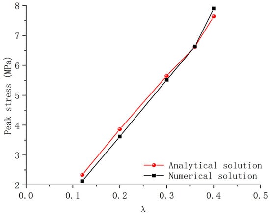 Based on Figure 17 and Figure 18, it is observed that as the λ value increases, the peak fluid pressure during the damage of bonded rock surfaces also increases. The peak shear stress values obtained from the analytical solutions for different ratios (λ) of Young’s modulus between the cement sheath and the rock are 2.34 MPa, 3.861 MPa, 5.65 MPa, 6.618 MPa, and 7.642 MPa. In contrast, the numerical solutions yield peak shear stress values of 2.13 MPa, 3.616 MPa, 5.516 MPa, 6.632 MPa, and 7.9 MPa. The maximum error between the two methods is 8.97%, with an average error of 2.82%. This indicates some deviation or discrepancy between the analytical and numerical results in predicting the peak shear stress. After linear regression of the numerical solutions for the peak shear stress under different λ values, the slope is 20.5 with an accuracy of 0.9915. Therefore, it can be concluded that the numerical simulation method produces small errors compared to the analytical solutions under different ratios of Young’s modulus, indicating the scientific validity of the numerical modeling approach. This model is suitable for studying water channeling phenomena in injection wells under various cementing quality conditions. A higher ratio of Young’s modulus implies greater difficulty in damaging the bonded rock surfaces, thus improving cementing quality becomes one of the methods to prevent water channeling outside the casing of the injection well.
