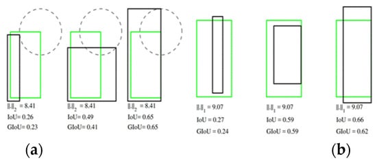 Comparison of IoU and GIoU [] (a) is the case where the 2-Norms of the two BBs are the same, and (b) is the case where the 1-Norms are the same.