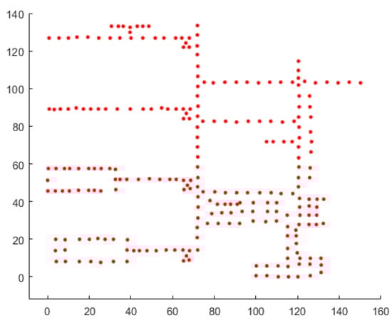 When the placement of these BBs is plotted against the arrangement of the original data points, we can observe that they are correctly distributed within the cell region. This proves the appropriateness of the cell division, as the clustering of the replaced BBs is correctly represented within the cells. Therefore, our cell division technique is the basis for computing the movement path. In Figure 4a shows that the division of the cells made sense when merged with the original data points.